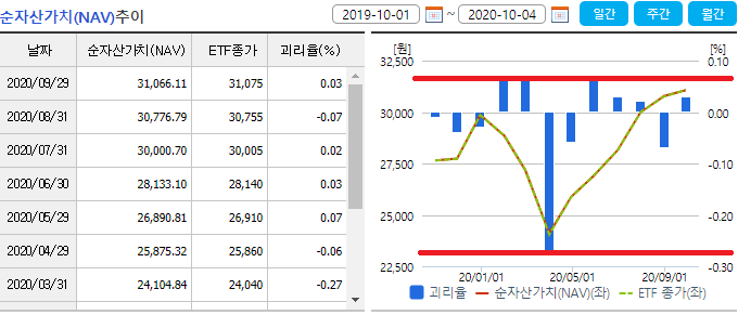 ETF는 ETF를 담고 있는 자산 가격이 수시로 변동하기 때문에 자산가치와 현재 ETF의 가치 간 괴리가 발생하나 확인해야 하는데요.