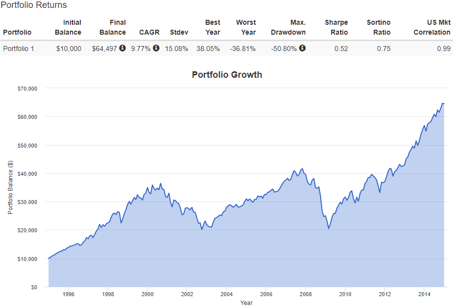 위 그래프는 1995년부터 2014년까지 S&P500 지수를 추종하는 ETF인 "SPY"에 투자했을 때의 그래프입니다.